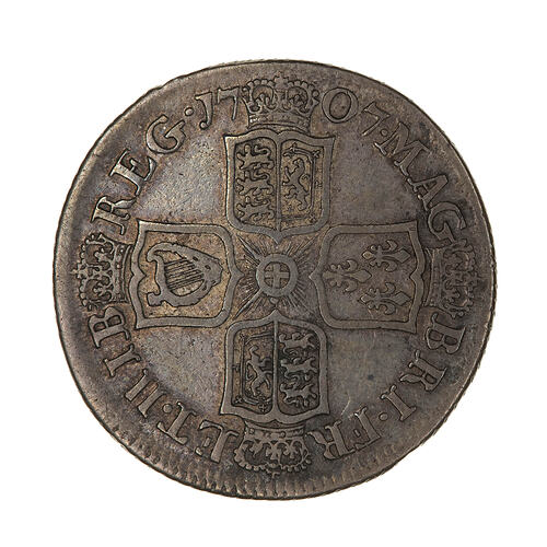 Crowned shields - with shields bearing the arms of England, Scotland impaled at top and botttom, Ireland at left and France at right forming a cross shape with the badge of the Star of the Garter at the centre; around, MAG BR FRA ET HIB REG 1707, the date being divided by a crown.