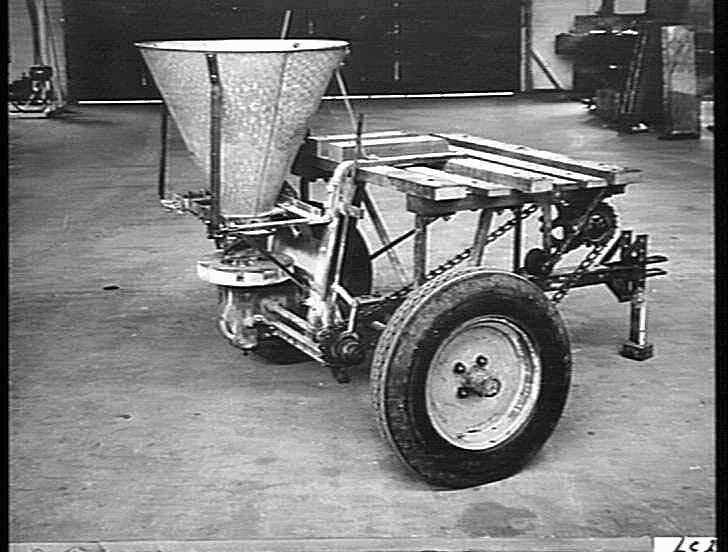 Pneumatic-tyred spinner-broadcaster used for spreading fertilizer. The spinner is chain-driven from a sprocket on the axle near the right hand side Wheel.
