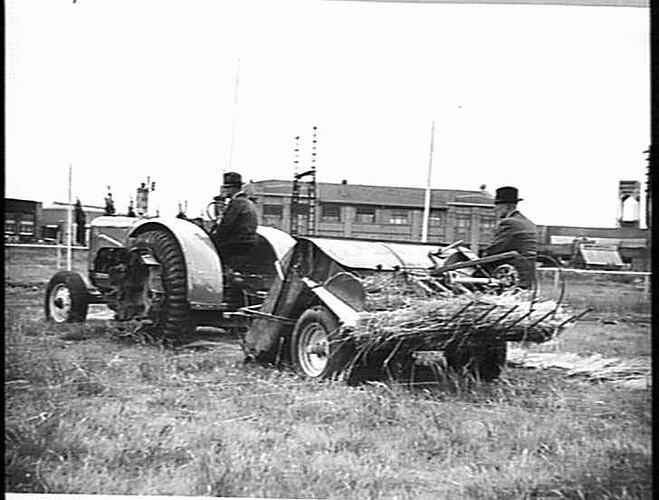 A pick-up binder, drawn by a Massey Harris tractor, being trialled on the railway reserve, now known as Chaplin Reserve, on Anderson Road, Sunshine. The H.V. McKay head office is in the background. (the 'old smithy' can be seen on the right hand side Below the wate.
