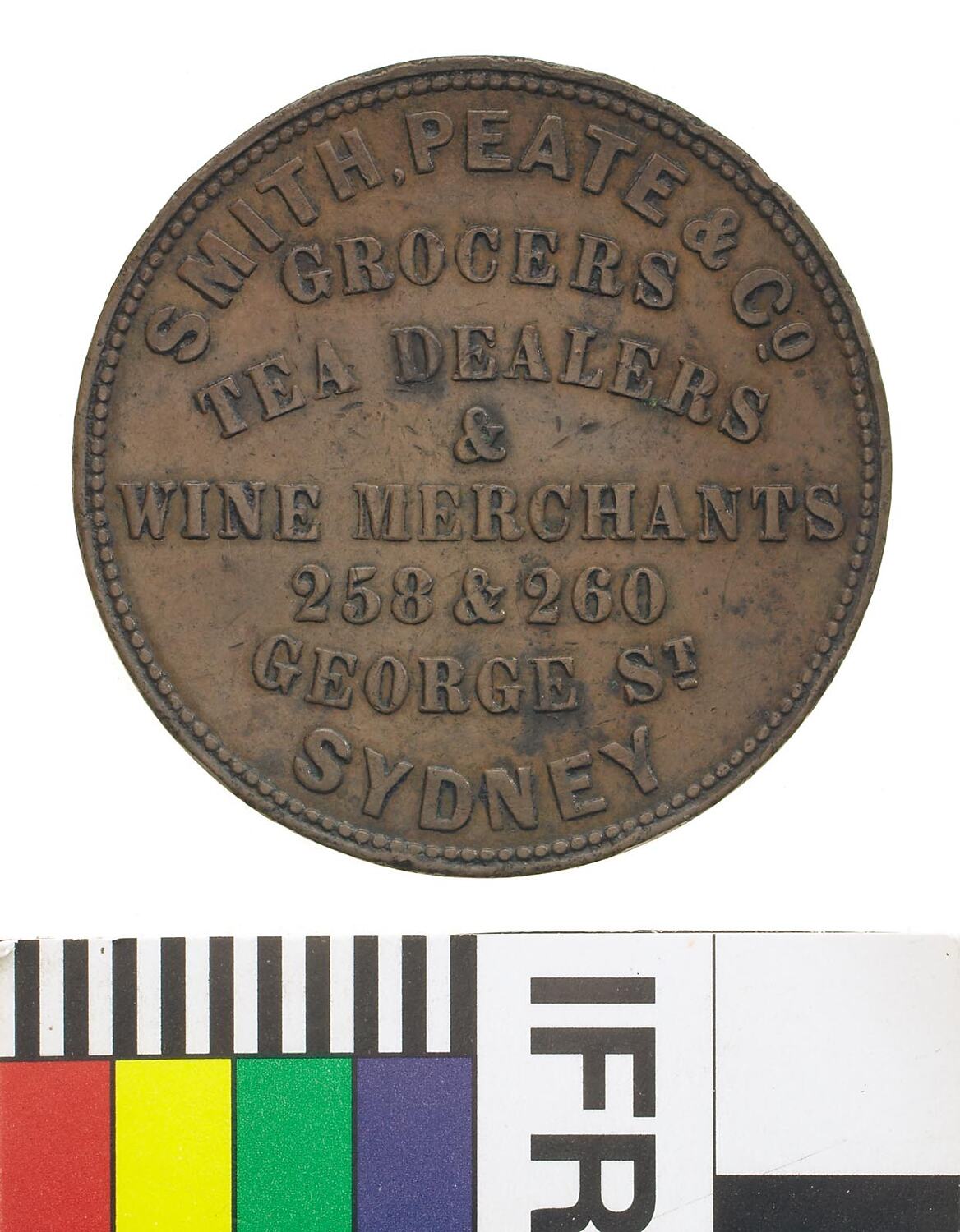 Obverse: SMITH, PEATE & Co. GROCERS TEA DEALERS & WINE MERCHANTS 258 & 260 GEORGE ST. SYDNEY Reverse: ESTABLISHED 1836