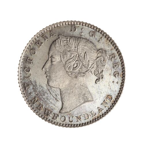 Laureate head of the Queen, with plait of hair falling below the ear, facing left; around below, . NEWFOUNDLAND; around above, VICTORIA D:G: REG: