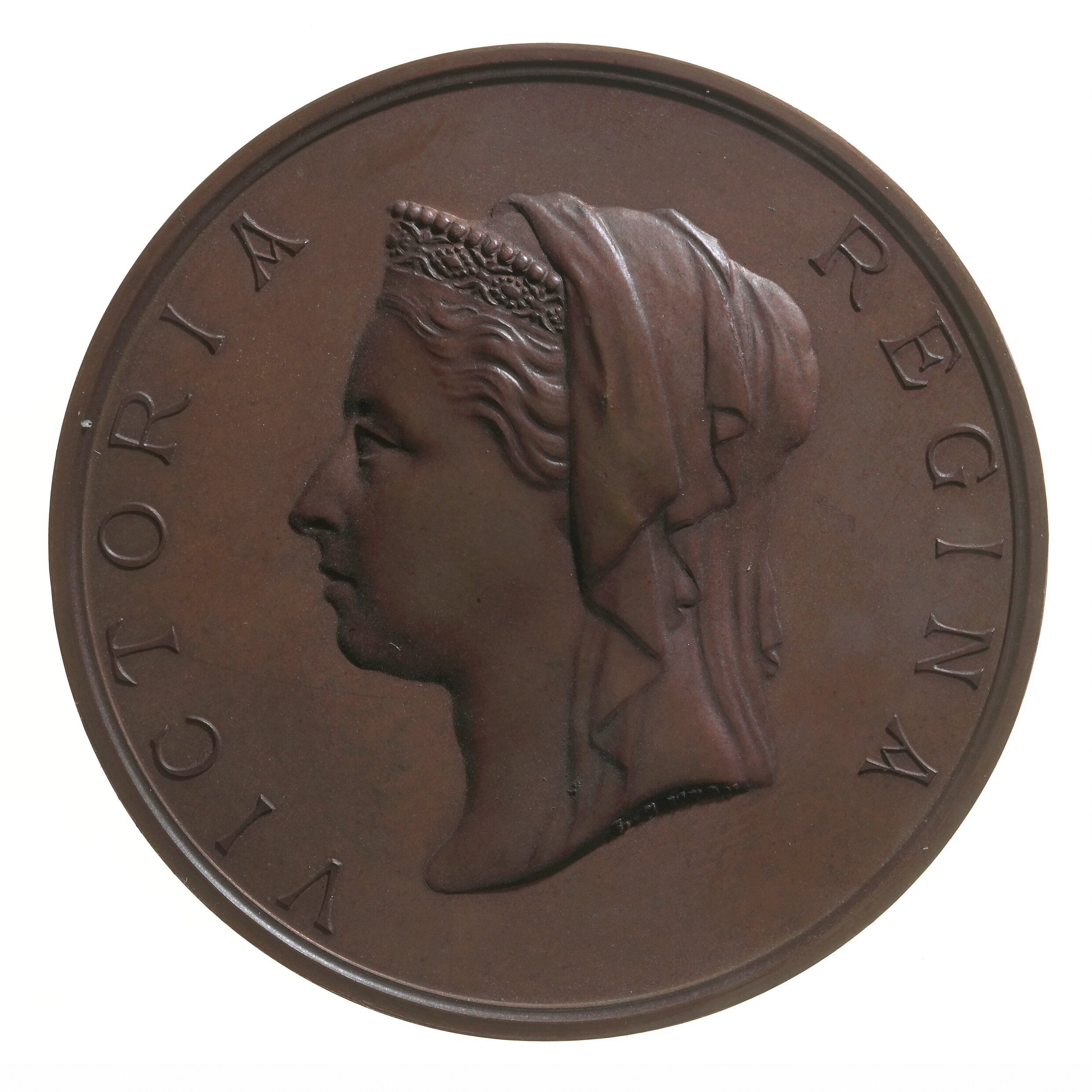 Veiled head of Queen Victoria facing left, wearing coronet; around, VICTORIA REGINA Artist's name in small letters on truncation, L. C. WYON