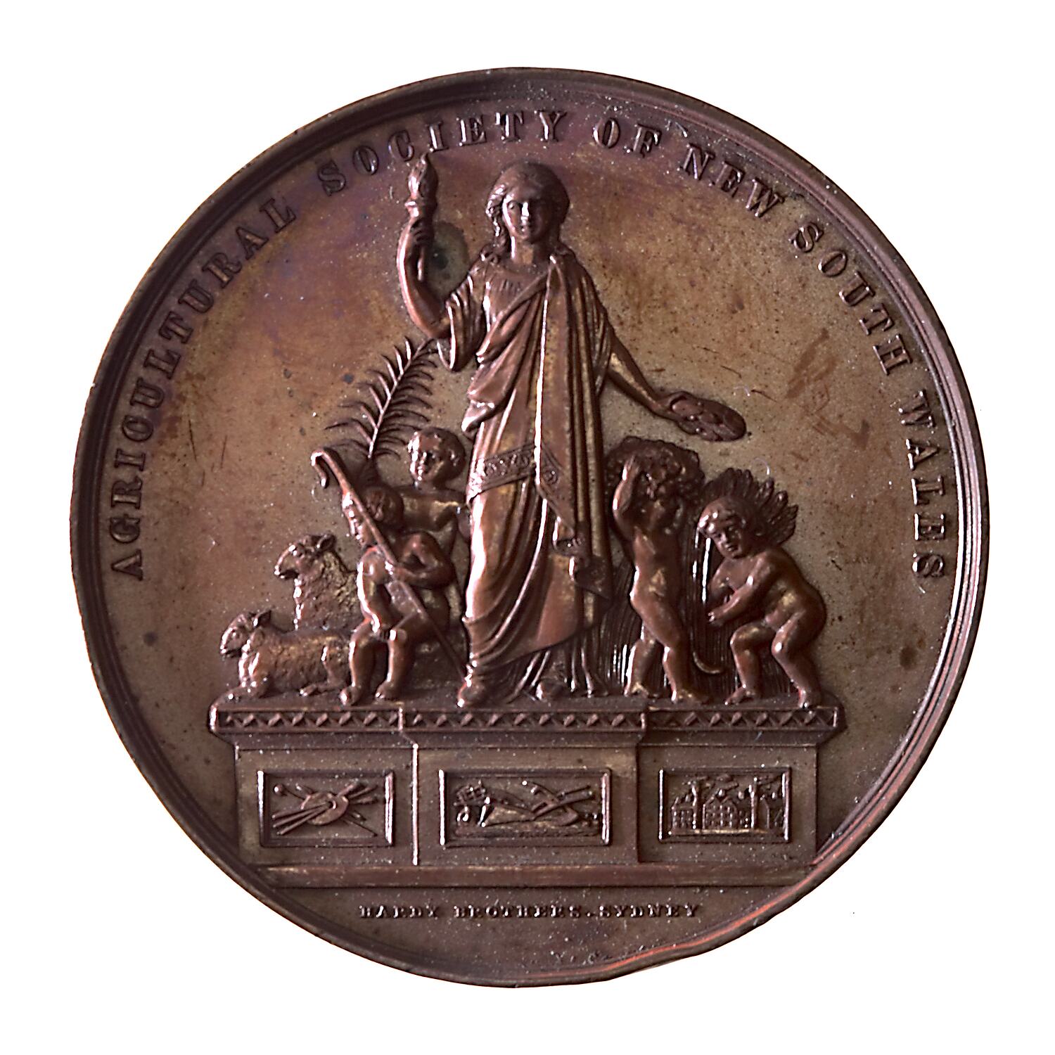 New South Wales, standing facing, holding a lit torch and a Victor's wreath, around her four children harvest wheat, carry grapes and; below on three panels art, agriculture and industry are representeed. tend sheep; around above, AGRICULTURAL SOCIETY OF NEW SOUTH WALES in small letter below HARDY BROTHERS LONDON & SYDNEY