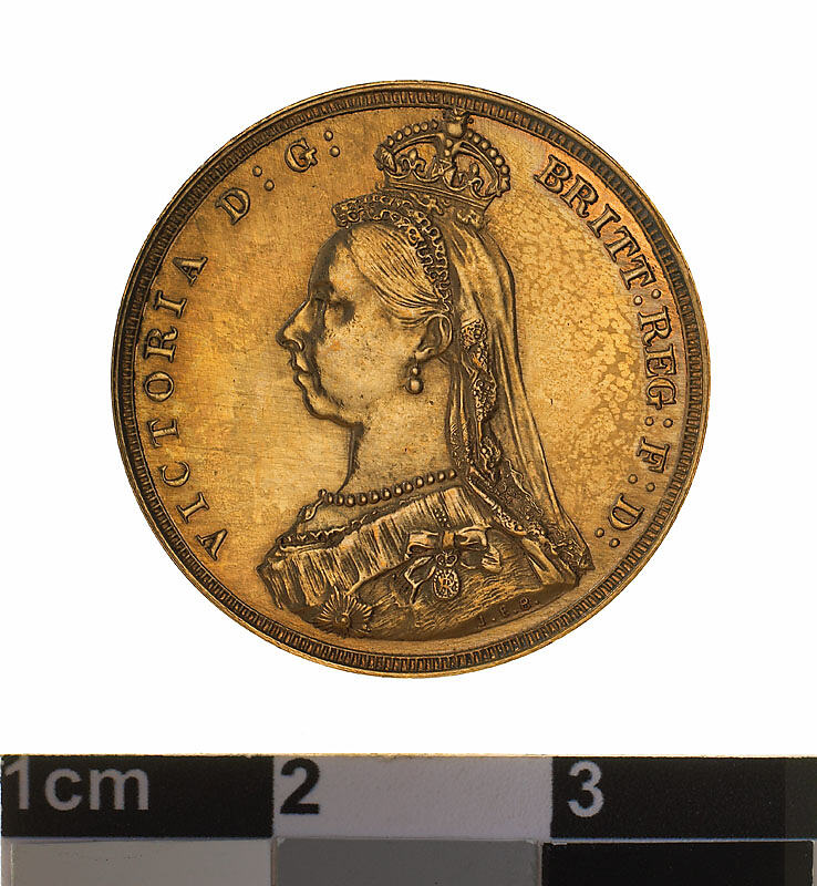 A proof gold coin (21.5 mm diameter with plain edge) featuring the Jubilee bust of Queen Victoria wearing imperial crown and facing left, a long veil falls behind the head, the bust is draped and decorated with the Star of the Garter, and also the badge of the Imperial Order of the Crown of India; around, VICTORIA D:G: BRITT: REG: F:D: , the artist's initials J.E.B. below the shoulder.The reverse features St. George on horseback holding a short sword in his right hand, the horse rearing to right over a fallen dragon which has a broken lance in its chest; in exergue, the date, 1887 and the artist's initials B.P.; the mint mark, S, is in the ground above the middle of the date.
