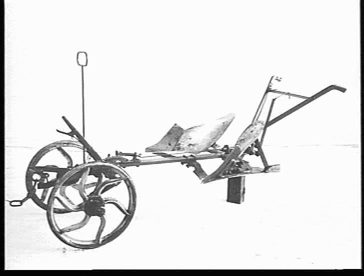 A horse-drawn single furrow reversible mouldboard plough, for market garden use. The adjustable blade-coulter is mounted on the frame above the plough share. The mouldboard and coulter are shown here in the transport position. Note the ring above the front wheels supported the reins to the horse.