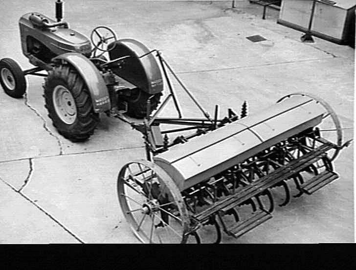 Overhead view of a 30KMassey Harris tractor attached to an experimental 16-row 'Sundelve' (rigid tyne) seed & fertilizer drill, fitted with large capacity hoppers, concave wheels with bar scrapers, and screw-lift operated from the tractor seat. Note the.