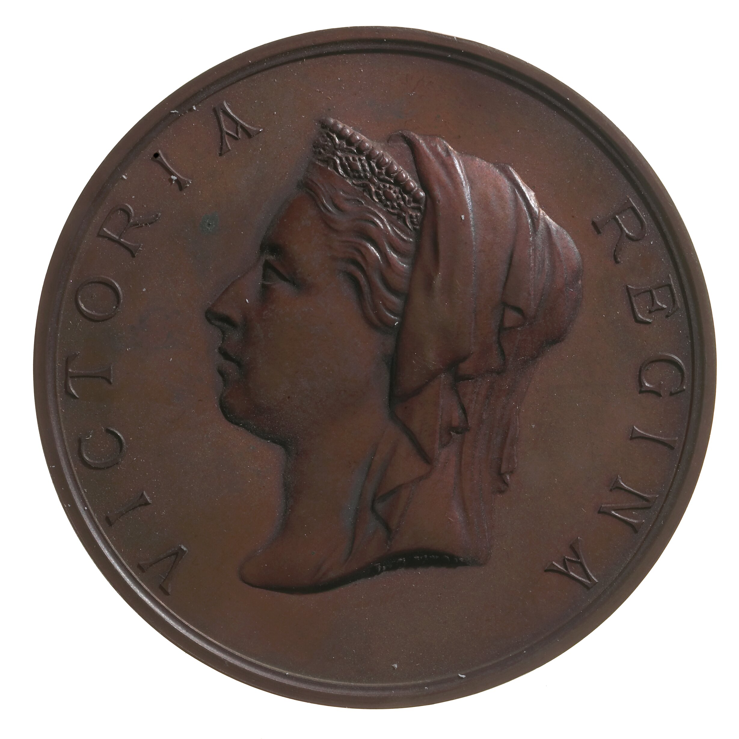 Veiled head of Queen Victoria facing left, wearing coronet; around, VICTORIA REGINA Artist's name in small letters on truncation, L. C. WYON