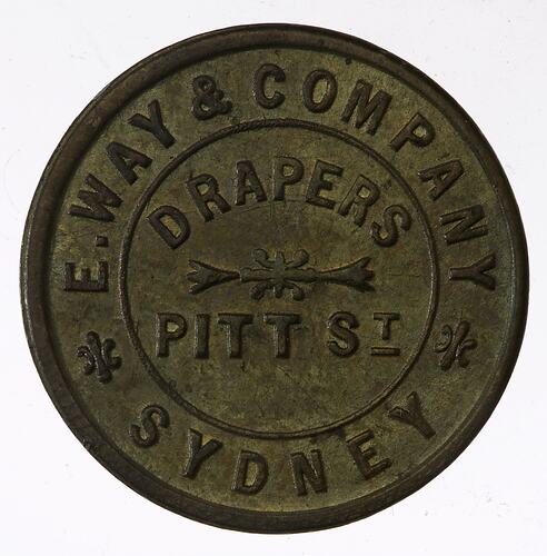 Medal issued for E. Way and Company, Drapers in Pitt Street, Sydney. The medal suggests that customers 'kindly drop us a card or inspect our counters for what you require'. The company sold goods including ladies' and children's underclothing, mantles, costumes, millinery and general drapery. It claimed to be the 'cheapest draper in Sydney'. E. Way was established as a department store in Pitt Street in 1891 and, together with David Jones, became a focus of early twentieth century retail trade in central Sydney. It featured an elaborate facade, entertaining window display and a wide range of merchandise.