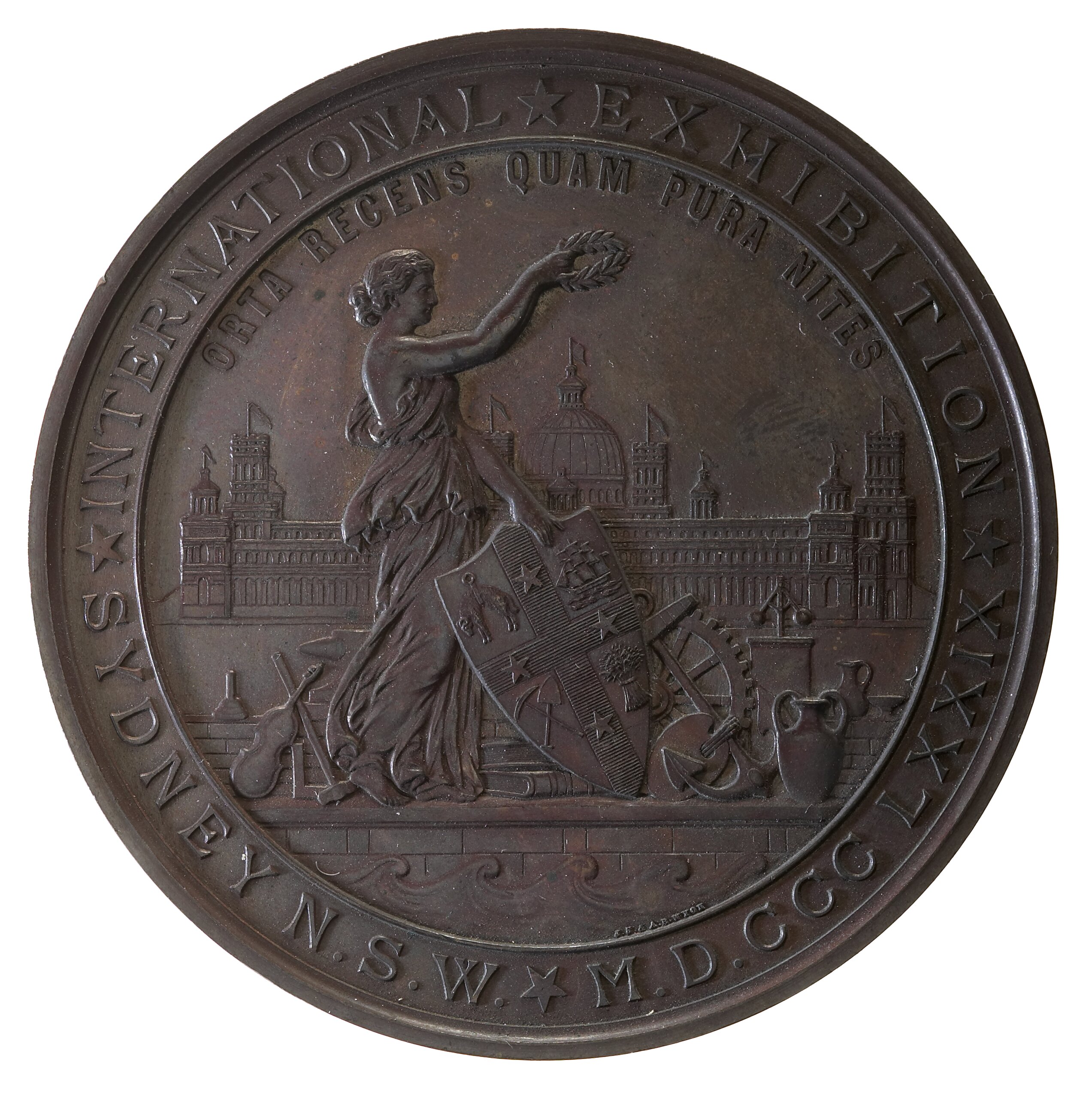 Figure of New South Wales surrounded by works of industry before exhibition building; around, * INTERNATIONAL * EXHIBITION * SYDNEY N.S.W.* M.D.CCC.LXXIX in exergue, waves, below these waves in tiny letters the artists names, J.S. & A.B. WYON