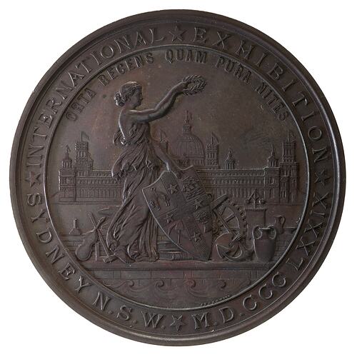 Other Details: This unissued medal was part of the Sydney Mint collection. It was purchased by Dr William Howat at the closure in 1926 and given to the National Gallery of Victoria. The Sydney International Exhibition was the first true international exhibition that an Australian colony had hosted. Previous exhibitions had been local or intercolonial. The International Exhibition was held in a purpose-built building at Inner Domain, featuring 15 acres of display area and a main dome 210 feet high. Four towers of this 'Garden Palace' provided spectacular views of the city and harbour, and the galleries were illuminated with stained glass skylights. The Exhibition was opened by His Excellency Lord Augustus Loftus on 17 September 1879, whose arrival in Sydney from England the previous month as the new Governor of New South Wales had been received with great enthusiasm. The Exhibition attracted over 1.1 million visitors, at a time when the population of New South Wales was 739,385. Awards for exhibitors were announced by the judges on the closing day, 20 April 1880. Gold, large silver, small silver and bronze medals and diplomas were awarded. The medal's obverse was based on a design by Samuel Begg and subsequently altered by J.S. and A.B. Wyon, who prepared the dies. The wreath of Australian flowers on the reverse was designed by James W. Sayers. The gold and silver medals were struck at the Sydney branch of the Royal Mint, and the bronze medals were struck in London. About 7,554 awards were made. The exhibition was so popular that the government purchased many of the prize exhibits and set up the Technological, Industrial and Sanitary Museum, the grandparent of the Powerhouse Museum. The Garden Palace burned down in 1882.