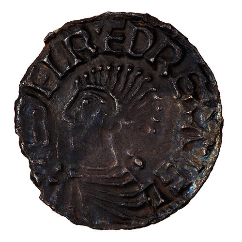 A bust of the King wearing armour facing left, the base of the bust reaches the edge of the coin, around, + AEDELRED REX ANGL