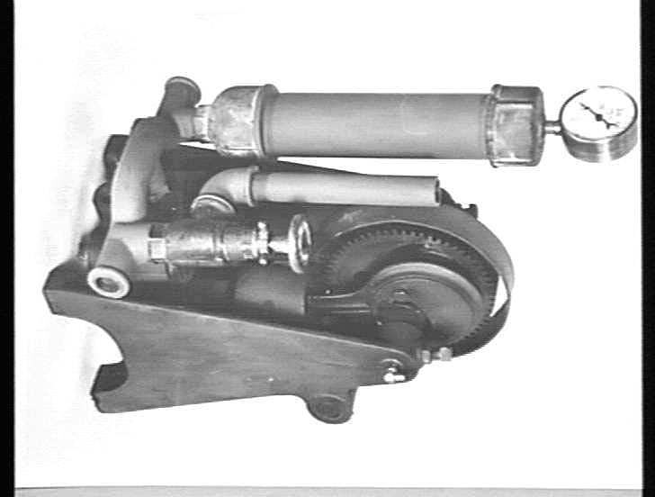 The pump and gauge for pressurising the tank on a spray unit. The plunger is operated by the cam-driven con-rod, connected to the spur gear.