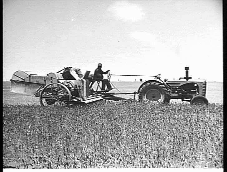 Mr J. P. Whelan, Wycheproof, Victoria, harvesting 350 acres of 'Quadrat' wheat, with a 10-ft cut No. 6 Sunshine Power-Drive Header coupled to a Model 44k Sunshine Massey-Harris Tractor, January 1949. The tractor is being operated from the driving seat of the header by 'one-man' control.