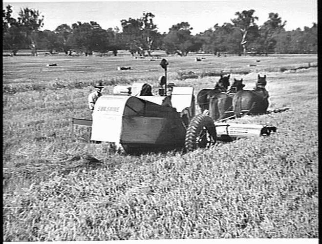 3-horse team pulling a No.6 engine functioned header in a crop of 'paddy' rice. The bags of rice dropped from the platform can be seen in the background.