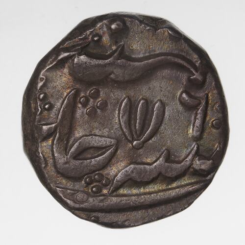 Persian legend, much off flan (translation: The auspicious coin of the Victorious Emperor Chosen of the faith of Muhammad - Alamgir)