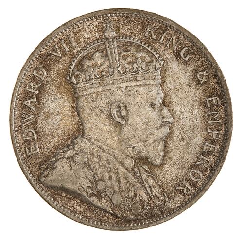 Crowned bust of the King facing left wearing an ermine robe, with the collar of the Garter; around, EDWARD VII KING & EMPEROR; artist's initials, DES, below bust