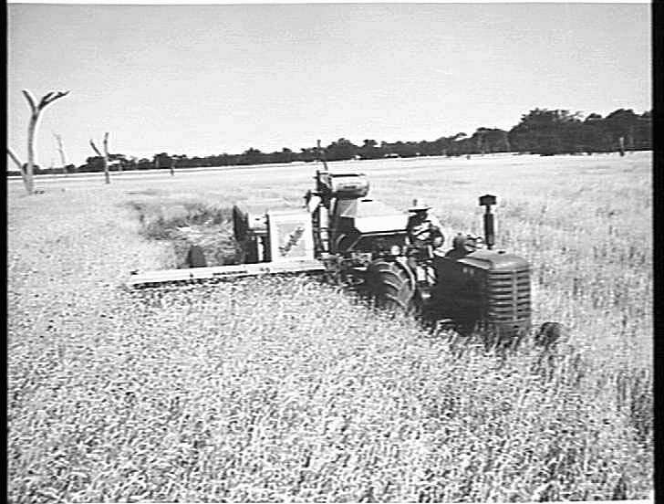 The Sunshine No.4 Power-Drive Header was a combine harvester, based on the famous Headlie Shipard Taylor design, produced at the Sunshine Harvester Works in Victoria, between 1946 and 1955. It was designed specifically for tractor operation with the mechanism of the cutting & gathering head, threshing drum, winnower, straw walkers, elevators and conveyors driven directly from the power-take-off shaft of the tractor. It was typically used for harvesting cereal crops such as wheat, oats and barley, and was offered in two sizes with either a 10-ft or 12-ft wide cutting head and the options of a bagging platform or 30 bushel bulk grain box (hopper), as shown in this photograph. The adoption of a large grain box reflects the transition from bagged to bulk grain handling, introduced by the Grain Elevators Board of Victoria during WWII. The Sunshine No.4 Header was also offered in an Engine-Functioned version, with a dedicated onboard petrol engine replacing the function of the PTO drive, enabling operation by smaller capacity tractors. In the last years of production it was also offered with the option of a larger 36 bushel grain bin.