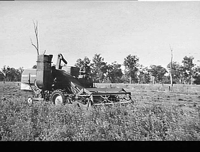 Self-propelled '726' header (manufactured in U.K.) Working in a crop of lucerne. This machine was powered by a'Newage Austin' engine and was fitted with an open- front and bat-reel to assist in passing material.