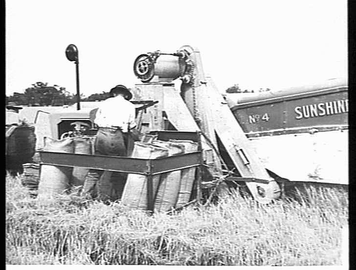 View of the bagging-off platform on a No.4 engine-functioned header being drawn by a diesel 'Caterpillar' tractor in a good crop of rice. Photo also shows the grain and repeat elevator going up to the screen.