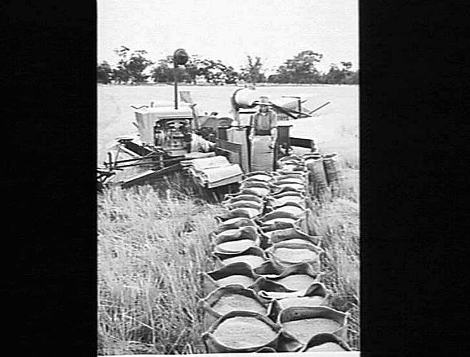 Photo shows bagged rice taken from the unloading platform of a Sunshine engine-functioned No.6 header. Note the bag hook in the operator 's left.