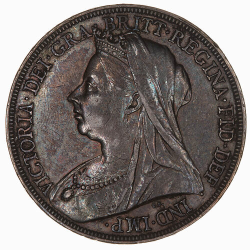 Within an open laurel wreath, crowned shield quartered with the sarms of England (1 & 4), Scotland (2) and Ireland (3); around, BRITANNIARUM REGINA FID: DEF:; below, a rose, thistle and shamrock united.