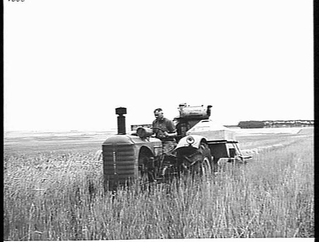 No.4 power-drive header drawn by a Massey Harris Model 55K tractor, fitted with a 'Vokes' type air cleaner and Sunshine spark arrestor, in a reasonable crop of'quadrat' wheat.