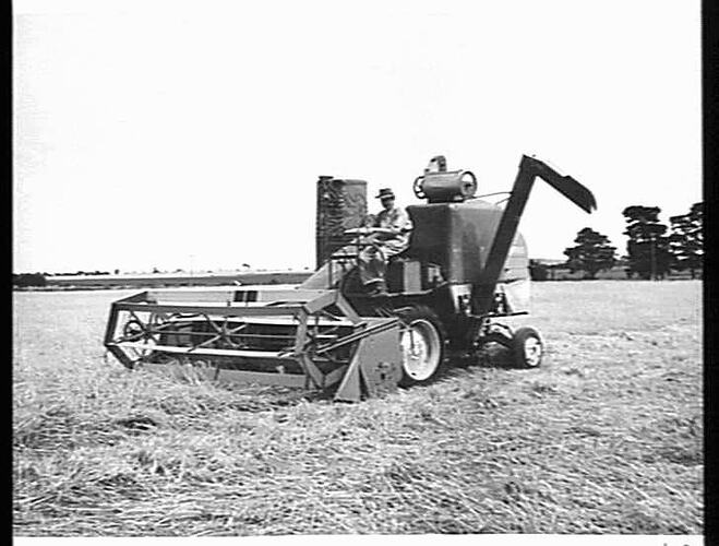Massey Harris Model 726 header, imported from U.K., fitted with open-front and bat-reel, harvesting a down and tangled crop of oats. The rotary screen (built at the H.V. McKay/m-h factory) for the extraction of.