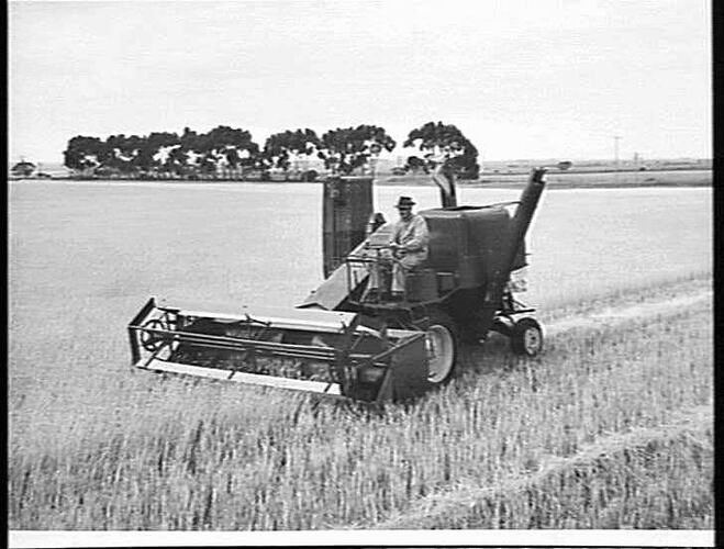 The 726 self-propelled header was a 10 ft Open-front machine imported from the united kingdom, powered by an 'Austin Newage' engine, fitted under the header. The picture shows the chain- driven bat-reel used for controlling the flow of crop over the cutt.