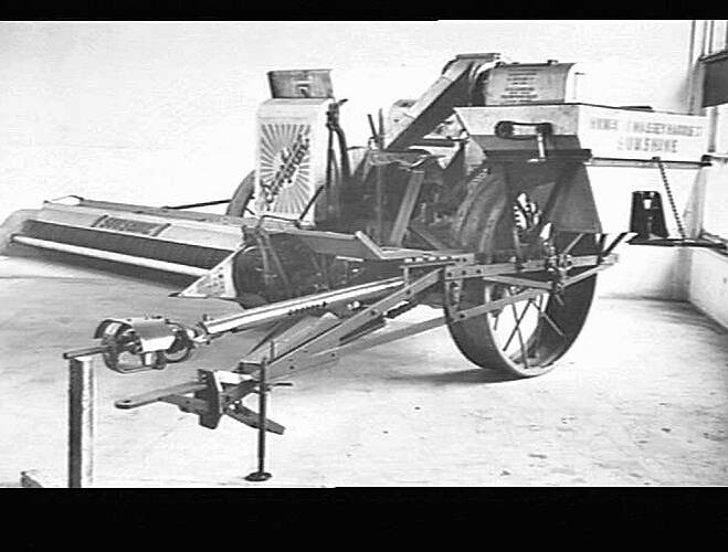 Power-take-off shaft on the header with the fittings to be bolted to the back of the tractor; also the tractor-pull and the jack to lift the draw-bar to the required height for connection to the tractor. A single bag-bow for the emptying o.