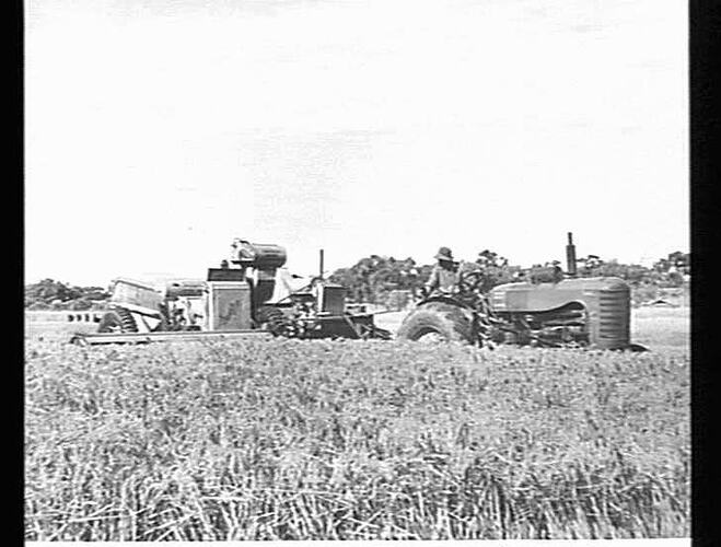 No.4 engine-functioned header drawn by a Massey Harris Model 744 diesel tractor (imported from the U.K.), harvesting rice at Griffith, N.S.W.