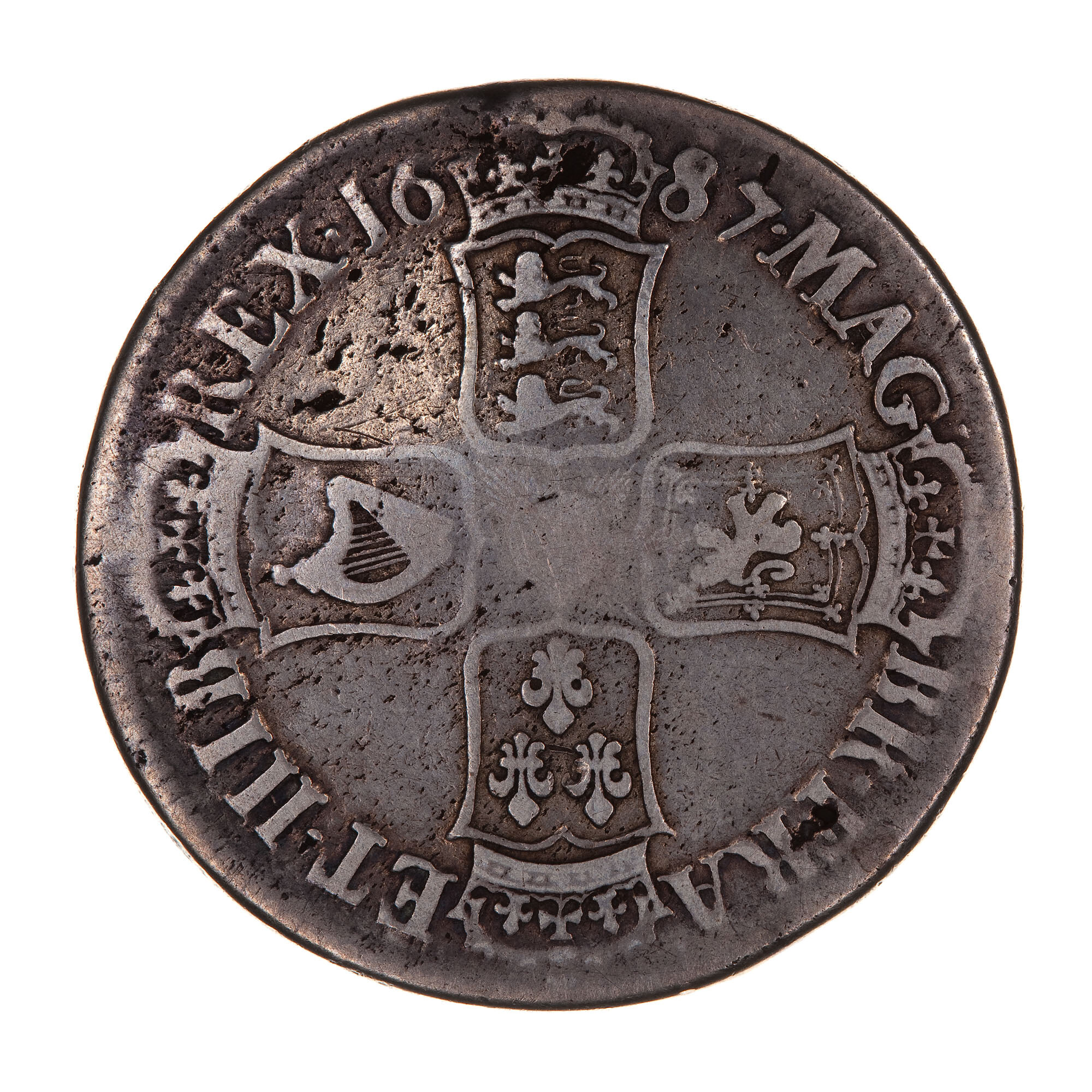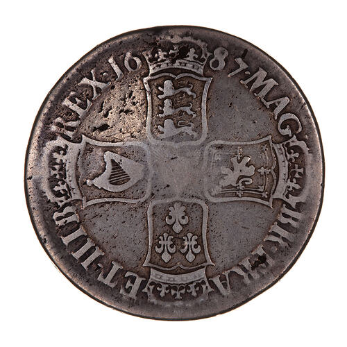 Four crowned shields, bearing the arms of England Scotland France and Ireland, arranged to form a cross; around, MAG . BR . FRA . ET . HIB REX 1687, the date being divided by the crown above the English shield.