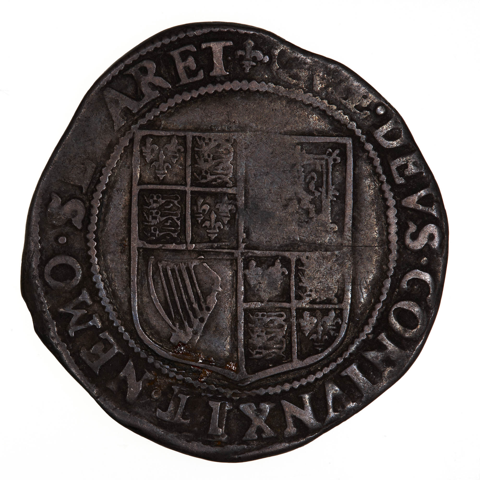 Within a beaded circle a square topped shield quartered with the combined arms of England and France (1 & 4), Scotland (2) and Ireland (3); around, (mm. lis) QVE DEVS CONIVNXIT NEMO SEPARET (translation, What God has joined let no man put asunder).