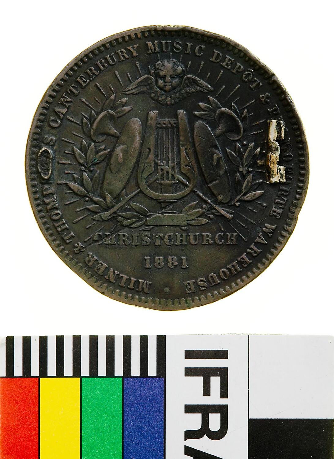 Obverse: MILNER & THOMPSON CANTERBURY MUSIC DEPOT & PIANOFORTE WAREHOUSE CHRISTCHURCH 1881 Reverse: ADVANCE NEW ZEALAND