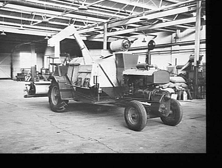 A rear view of an experimental auto header being developed in the engineering dep 't of the H.V. McKay factory. The power unit (situated above the two rear wheels) is fitted with centrifugal spark arrestor and vokes- type air cleaner. Also shown is the gra.