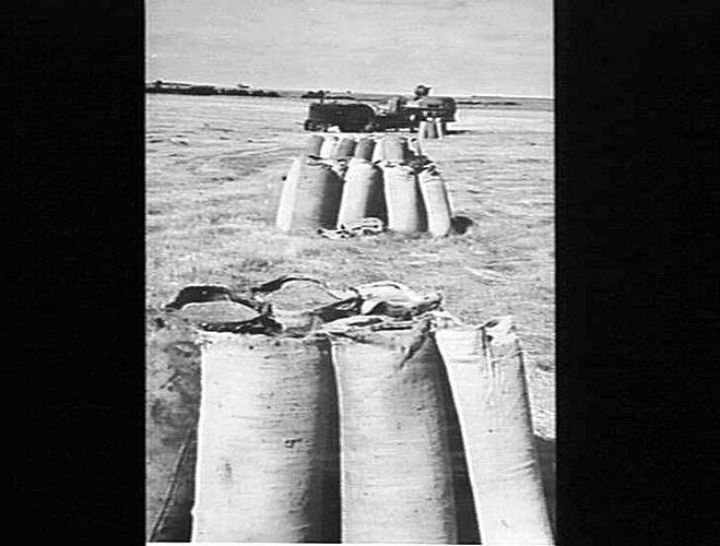 NO.4. HEADER HARVESTER FITTED WITH NO. 4. PICKUP ATTACHMENT TAKING OFF RYE GRASS ON PROPERTY OF MR. J.J.MC DONALD- BIRREGURRA. JAN.1948
