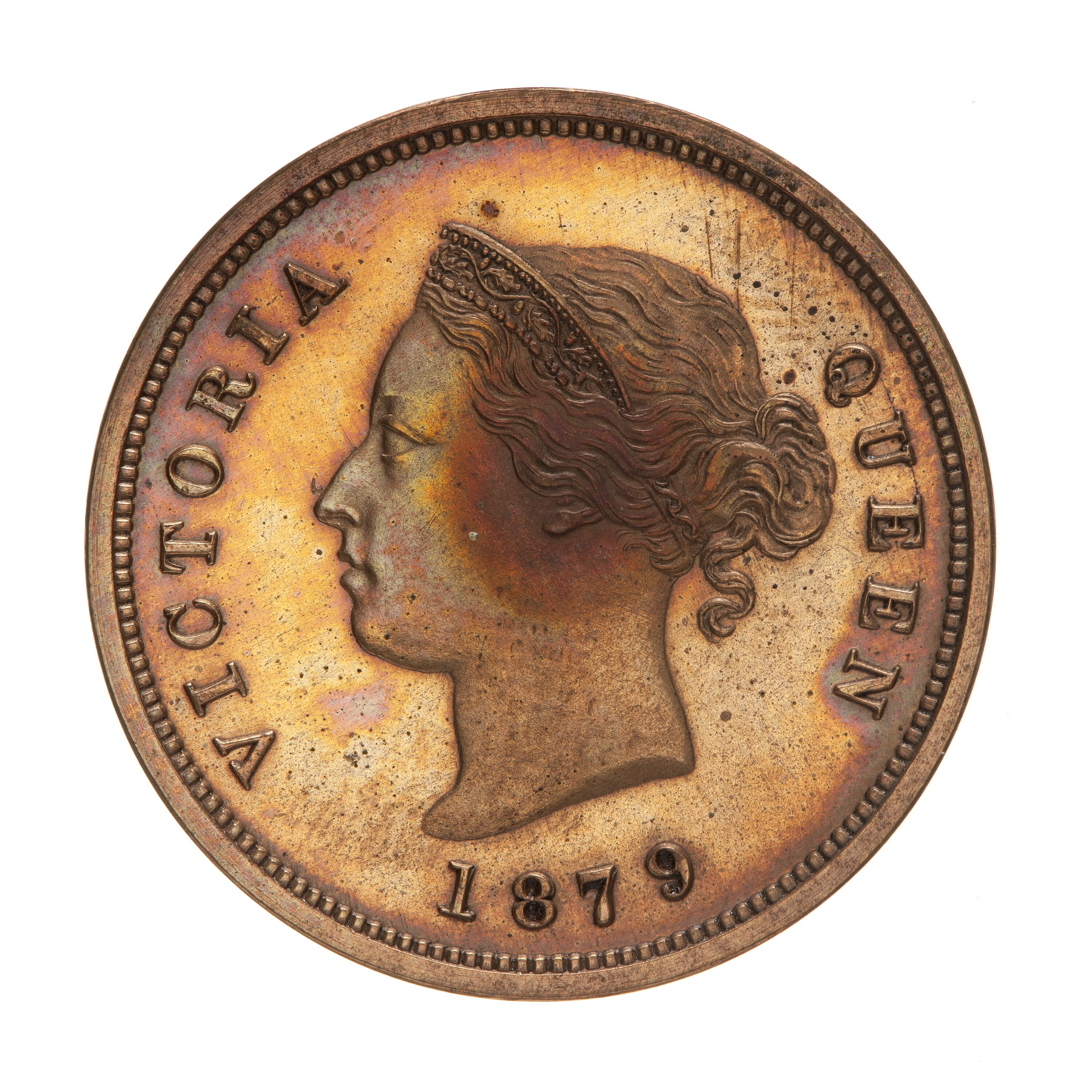 Head of Queen Victoria facing left wearing coronet which is ornamented with oak leaves and acorns; around, VICTORIA QUEEN 1879