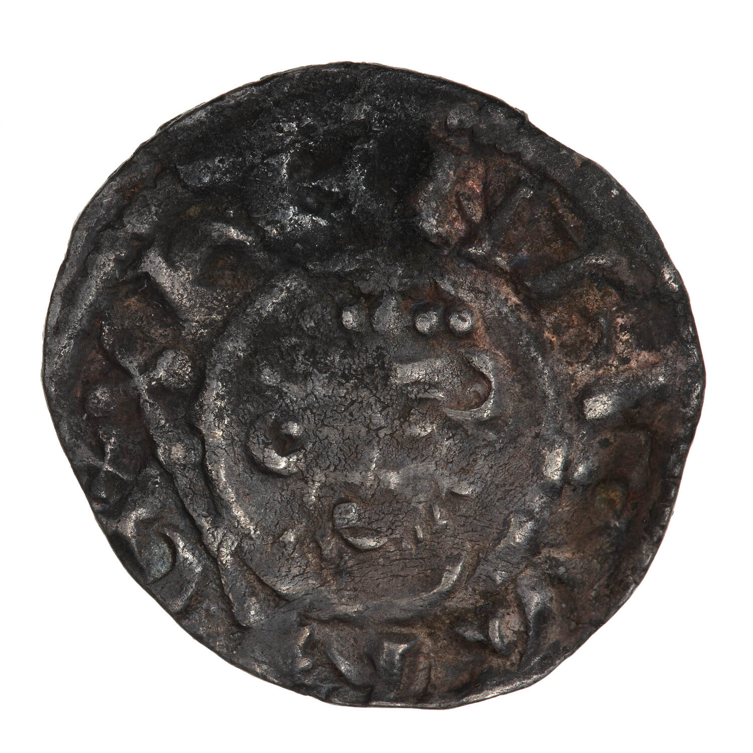 A short cross voided within a beaded circle, a quatrefoil in each angle; around, + ABEL ON LVN