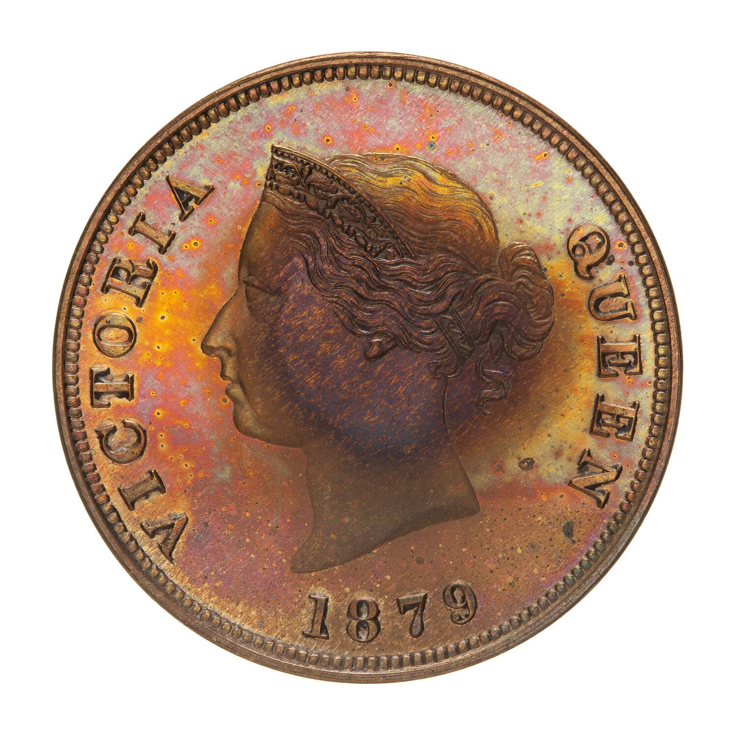 Head of Queen Victoria facing left wearing coronet which is ornamented with oak leaves and acorns; around, VICTORIA QUEEN 1879