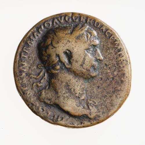 Orichalcum sestertius of the Emperor Trajan struck in the period 103 to 111 AD, Ancient Roman Empire. Minted by Rome. Trajan was Consul for the fifth time (COS V on this coin) in 104 AD and for the sixth time from 1 January 112 AD. This makes the period within which this coin was produced 104 to 111 AD.