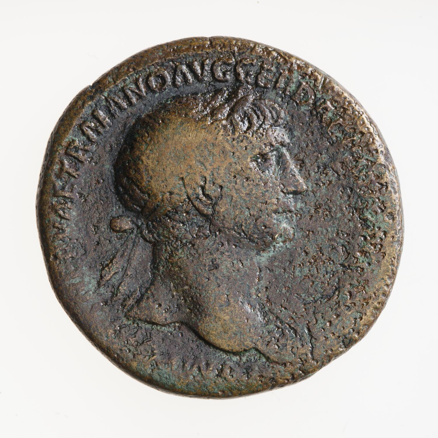 Laureate head of Trajan facing right wearing aegis; around, IMP CAES NERVAE TRAIANO AVG GER DAC P M [TR P COS V P P]