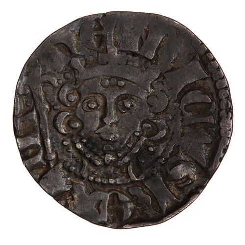 A crowned bust of the King facing within a beaded circle, holding a sceptre; around; HENRICVS REX III