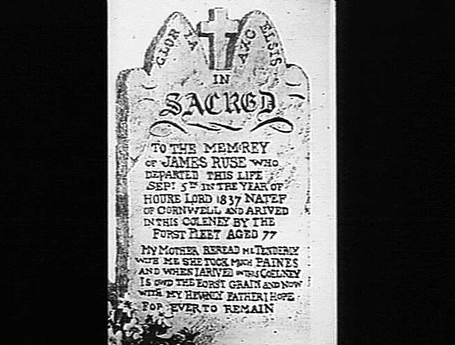 Image of the headstone of James Ruse, a first fleet convict. In 1789 Ruse became the first Ruse was the first ex-convict to seek a land grant. In November of that year Governor Phillip permitted Ruse to occupy an allotment near Parramatta, withholding the title until his capacity as a farmer and his right to freedom had been proved. The governor made this concession because he knew Ruse to be industrious and because he was anxious to discover how long it would take an emancipist to become self-sufficient. Image taken from the 'Sunshine Review' December 1949, from 'Australia's First Farmer', precis of a paper red before the Royal Australian Historical Society by M. K. L. Sampson',