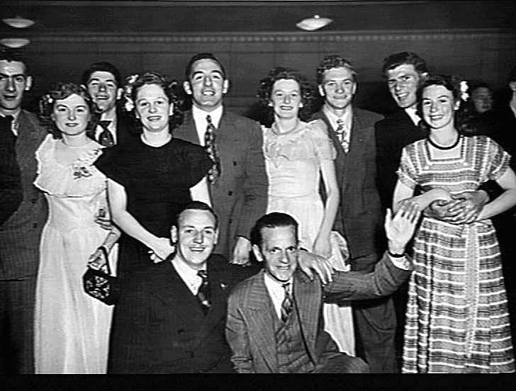 Black and white photograph of H.V McKay Massey Harris employees and friends enjoying the company Christmas Ball held at Brunswick Town Hall in 1949.