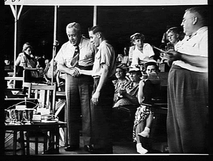Black and white photograph of A.D.J. Forster presenting the trophy to Harold Mason, winner of the Sunshine Handicap, at the H.V McKay Massey Harris picnic held at the Frankston Park in 1950.