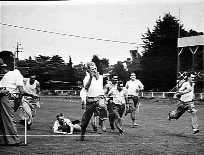 Black and white photograph of men participating in the Married Men's Race held during the H.V McKay Massey Harris picnic at Frankston Park.