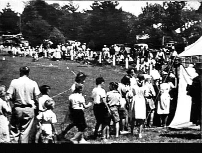 Black and white photograph of employees' children queuing for refreshments at the H.V McKay Massey Harris picnic, held at the Frankston Park in 1950.