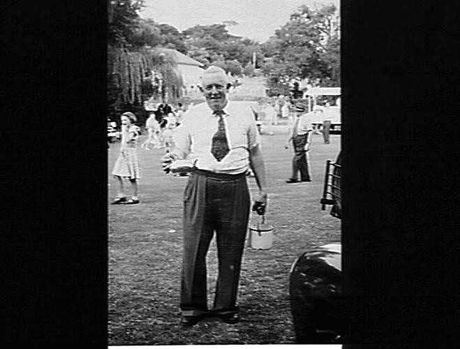 Black and white photograph of Vic McKay, Works Manager, enjoying the annual H.V McKay Massey Harris picnic, held at the Frankston Park in 1950.