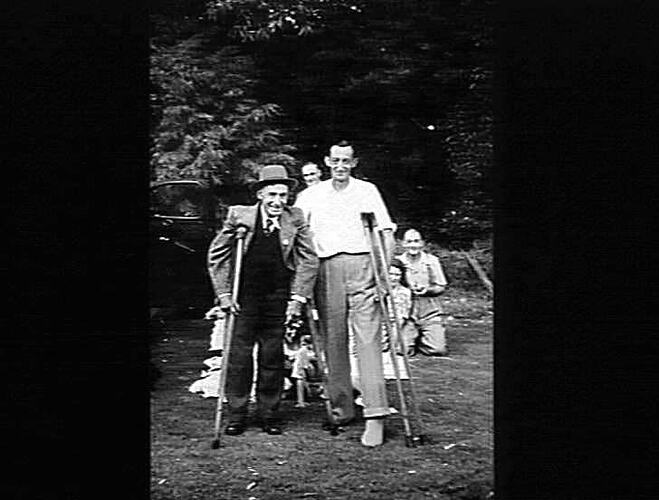 Two men standing with crutches in a park with a group of people looking on in the background.