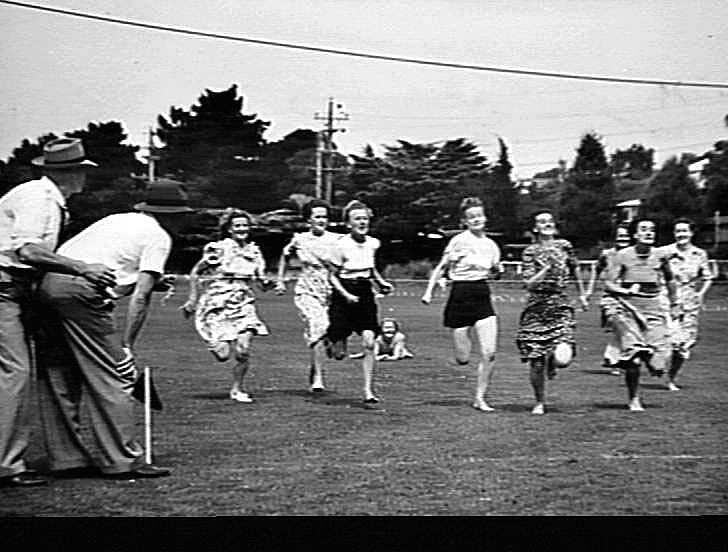 Black and white photograph of the Married Ladies Race held at The finish of the married ladies race at the annual H.V McKay Massey Harris picnic, held at the Frankston Park in 1950.