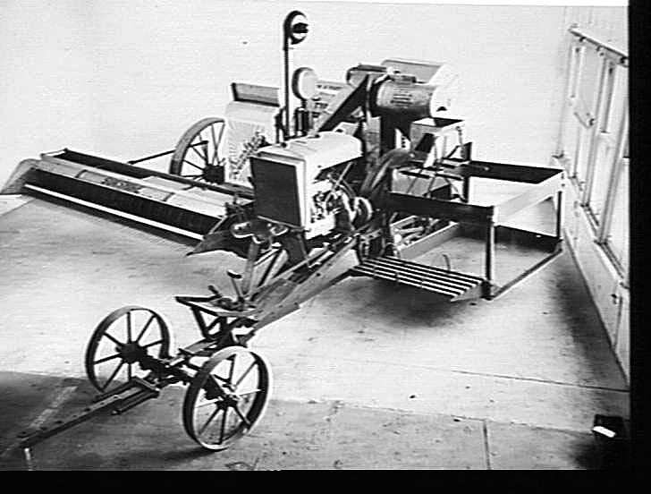 Front view of a No.6 engine functioned header powered by a 'standard' 4 cyl. Petrol/kerosene engine, fitted with a bagging-off platform and dual-wheel forecarriage and tractor draw-bar. Note the centrifugal spark Arrestor and the felt-covered air cleaner.